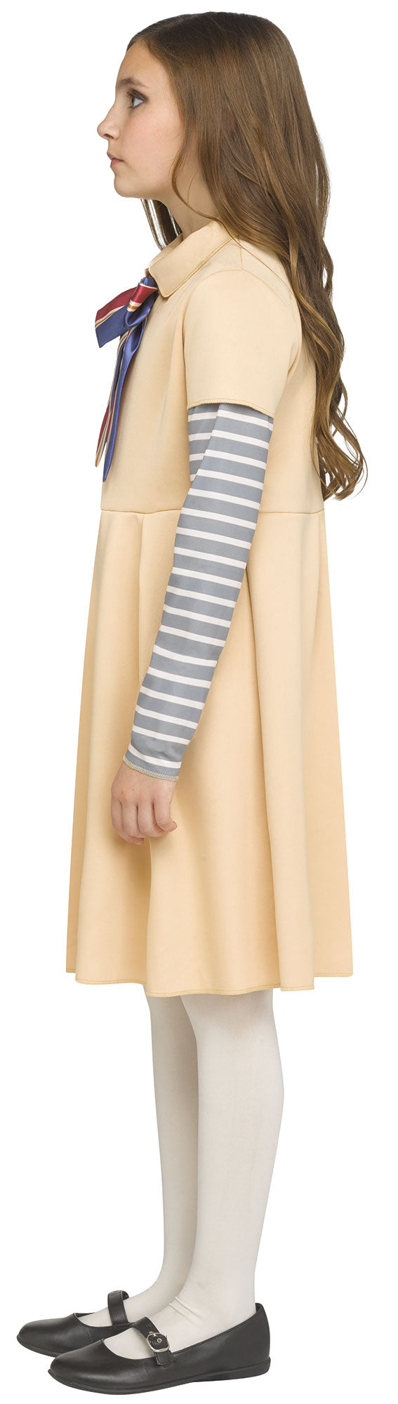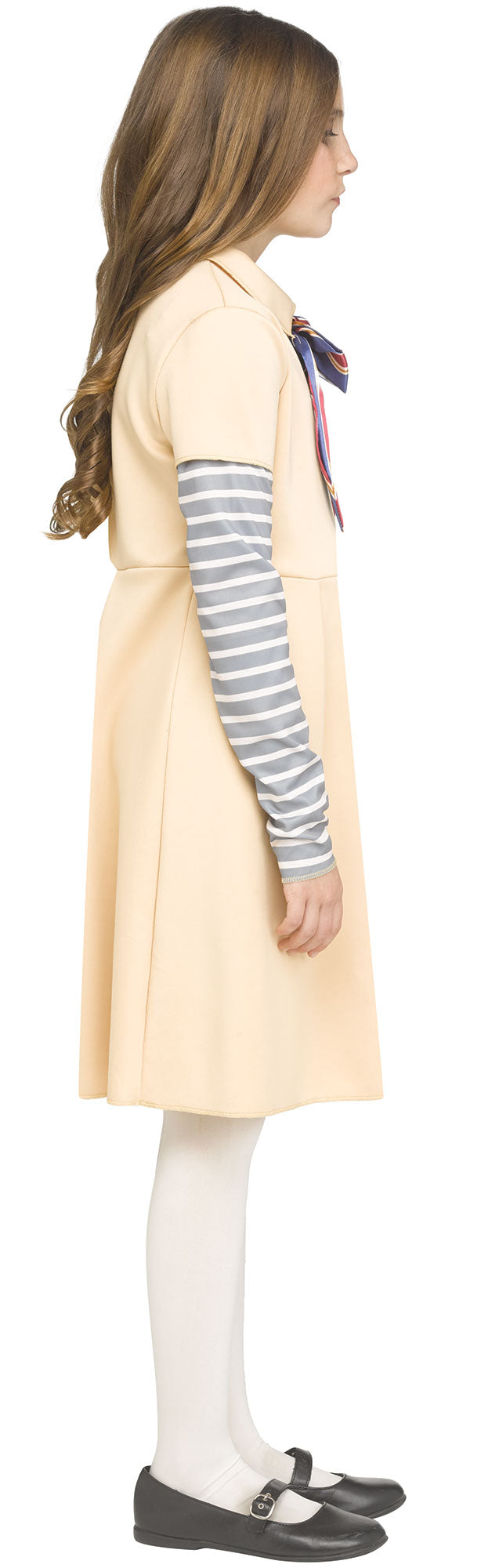 Includes striped attached lower sleeve and neck bow.