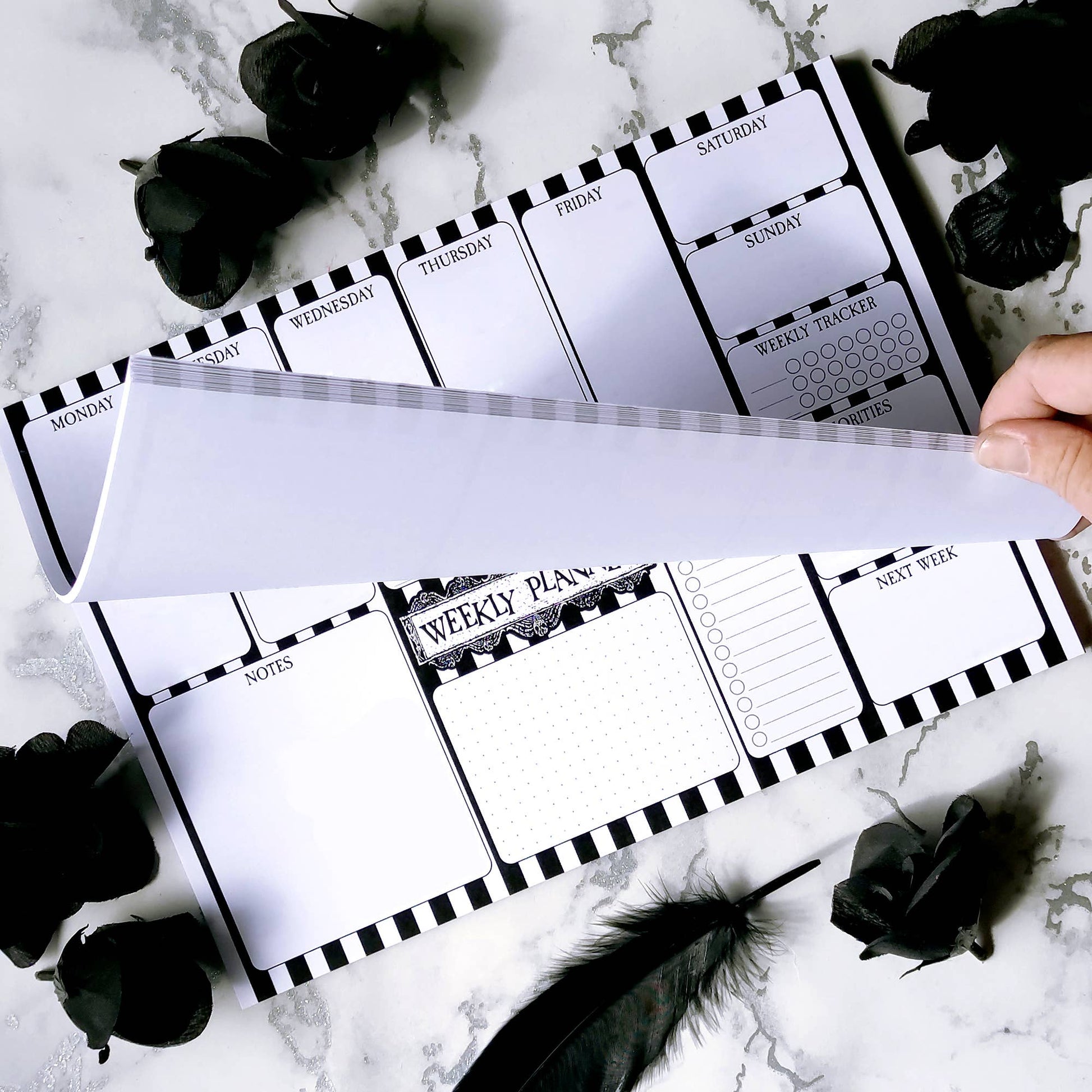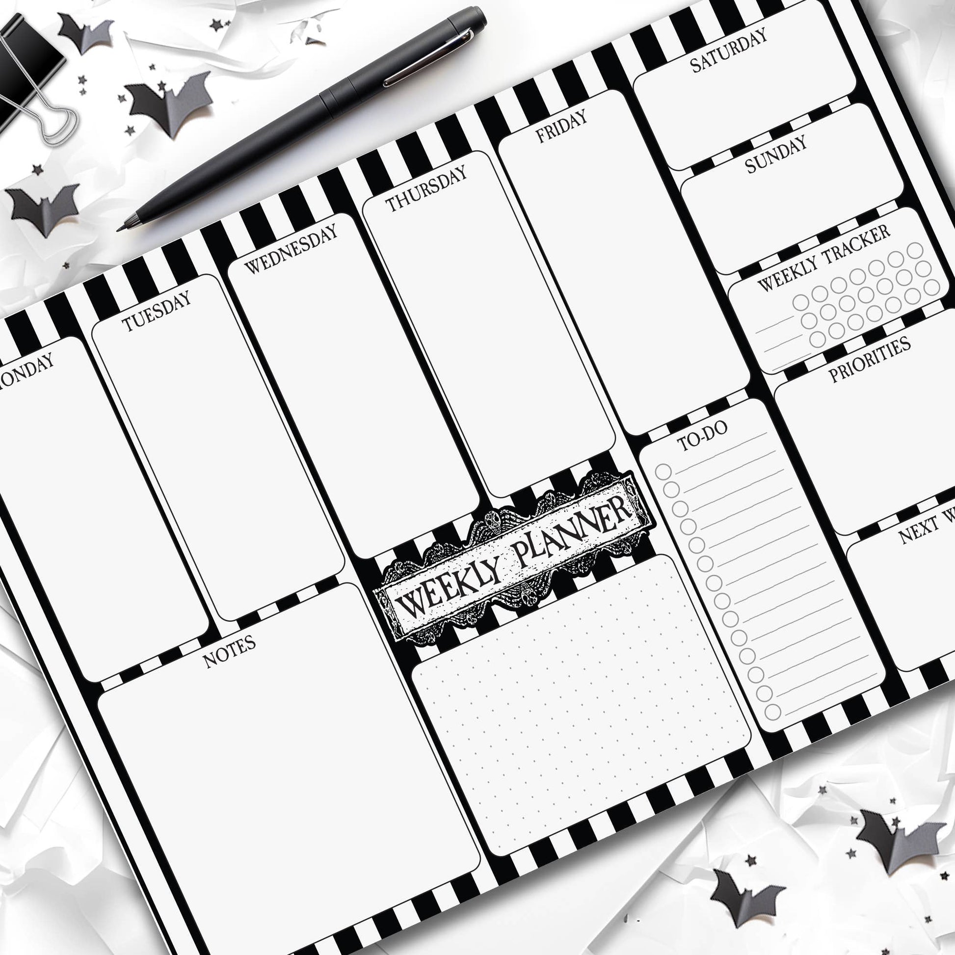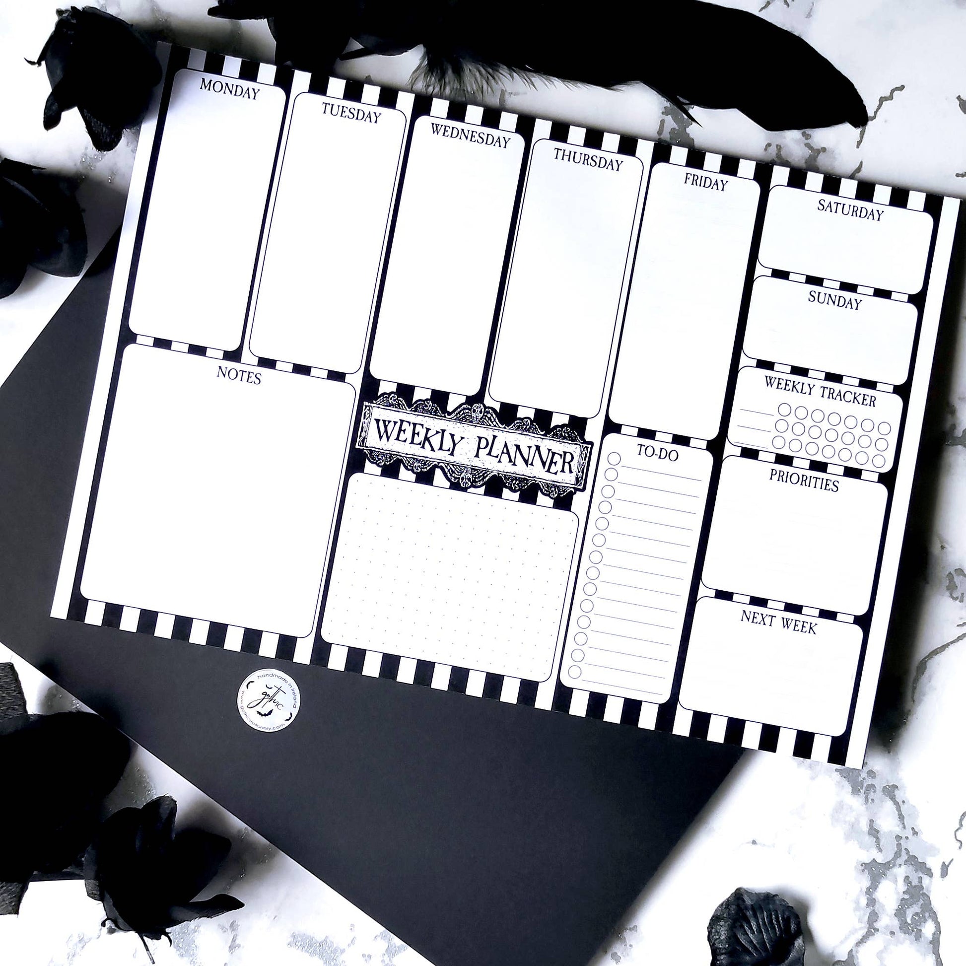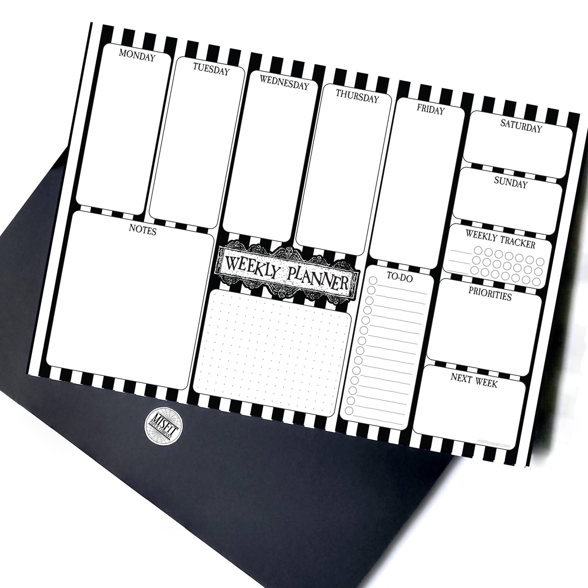 • A4 desk planner (29x20cm) • Soft backing • 55 tear-away pages. Featuring iconic Beetlejuice-inspired designs, this planner is perfect for fans of the macabre and alternative aesthetics. With its weekly layout, it provides ample space for planning and organizing, making it a must-have for those seeking unconventional yet functional stationery.