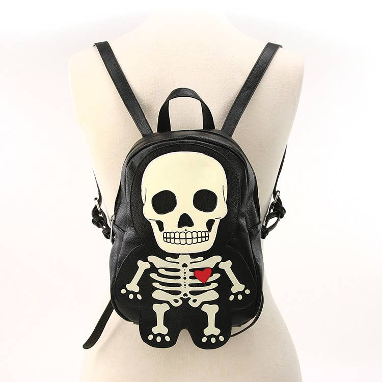 Crafted from a special glow-in-the-dark material, the exterior of the backpack features a captivating skeleton design that comes to life in dim lighting. Whether in a spooky setting or under the night sky, this backpack transforms into a luminous showcase of skeletal artistry. Zippered main closure Fabric lined interior Interior slip pocket Attached top handle Adjustable backpack straps High quality vinyl material Measures approximately Length: 9.5in Width: 5in Height: 6in