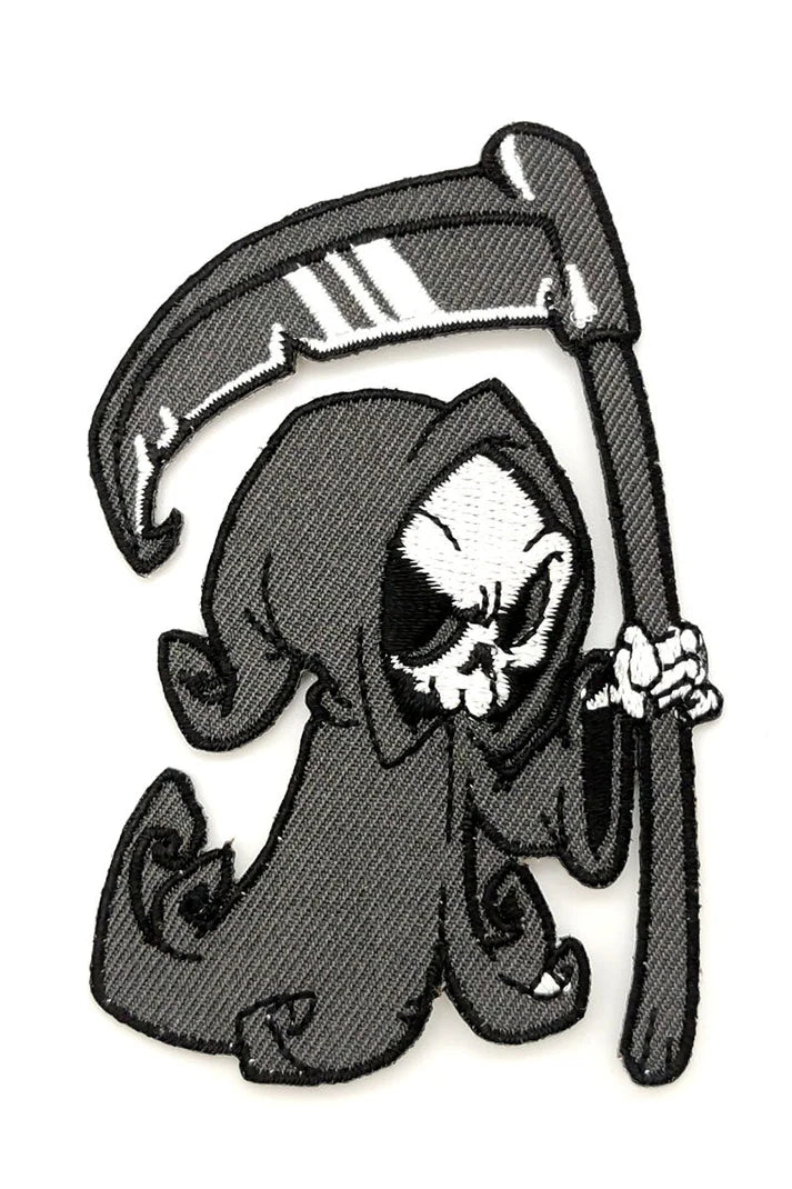 Up from the netherworld he rises, stalking the souls of the living with a scythe in his skeletal hand. He's always lurking just around the corner... waiting to drag his next victim down below to chill with his fiendish friends! With a reaper robe, sinister skull, and blade bigger than his body, bring death wherever you go with this hella gothy patch on yer pants!