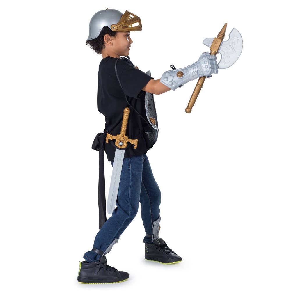 The Armor set is perfect for your little knight. The armor is designed to look authentic with the gold accents and details on the set. Both the breastplate and shield feature a gold cross in the center. The helmet’s visor is adjustable so that it can move up and down.