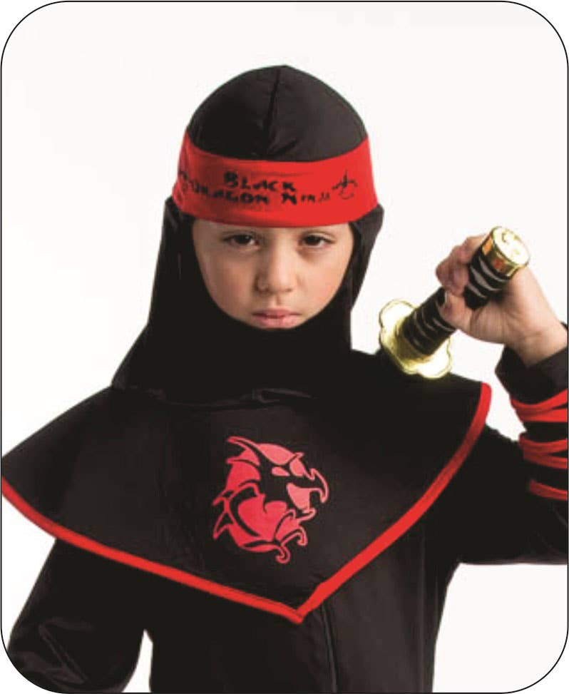 Product comes complete with: Jumpsuit with attached Ankle Ribbons, Hood with attached Collar and belt. Jumpsuit has a zipper closure in the front, Red trimming adorn the costume, Red belt has a Velcro closure in the back, Pull on Hood has an attached head band and collar, Stark black and red costume features Asian-inspired symbols on the belt and headpiece. Material/Fabric: Polyester Department: Boys