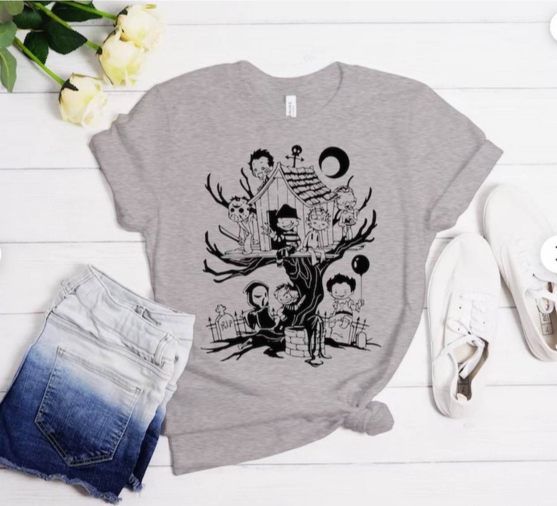 Halloween Tree House, Horror Movie Characters Shirt, Horror Movie Shirt, Halloween Shirt, Horror Fan Gift, Horror Movie Gift, Horror Fan Tee PRODUCT-- Heavy Cotton T-Shirt - Gildan - 5.3-ounce, 100% cotton 100% cotton (fabrication may be different for certain colors) - Double-needle neck; sleeves and hem - Roomy Unisex Fit - Taped neck and shoulders - Tear away label DO warm/cold machine wash DO NOT bleach/ dry clean/ iron directly onto the design