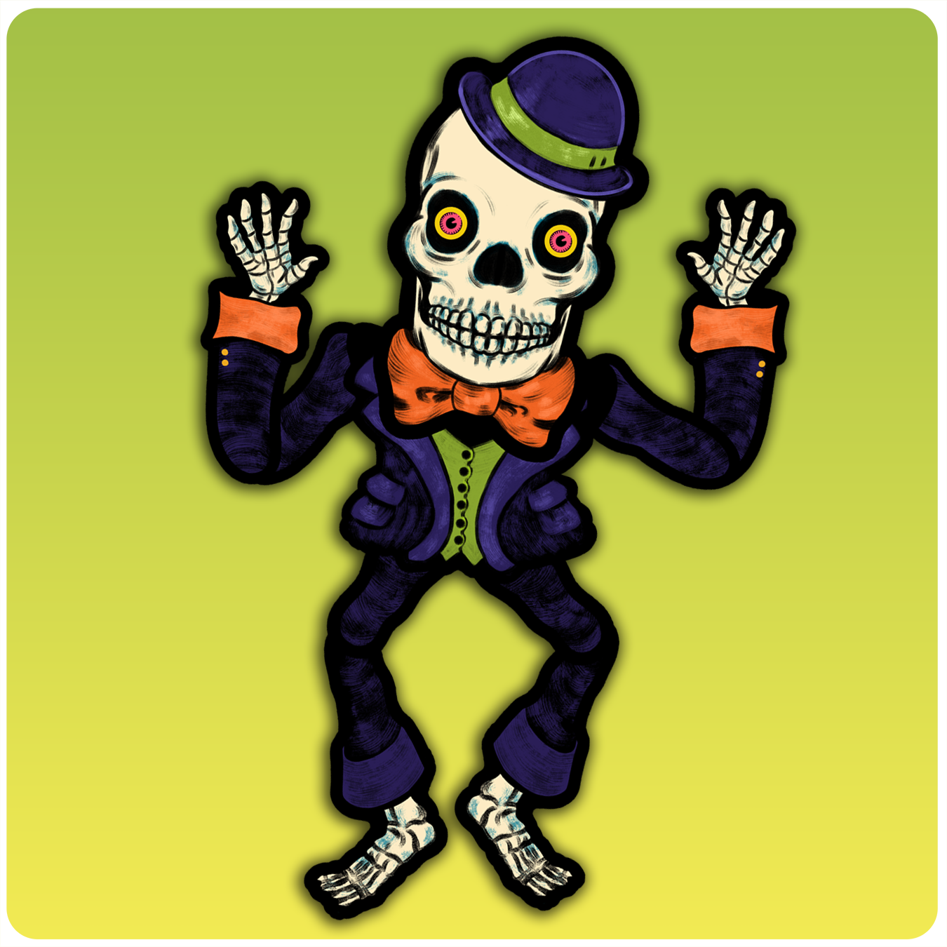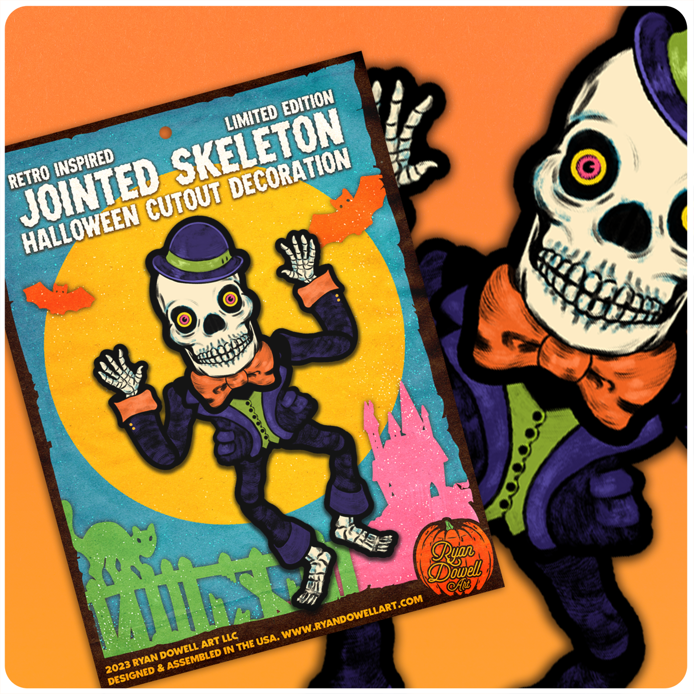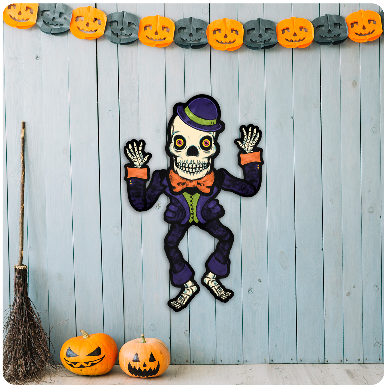 A large jointed cutout decoration of a skeleton with jointed arms and legs. Each decoration is printed on high-quality cardstock and arrives in resealable 12"x 9" vintage-inspired packaging. This decoration is inspired by many cutout decorations created in the sixties and seventies with large heads and different proportions.