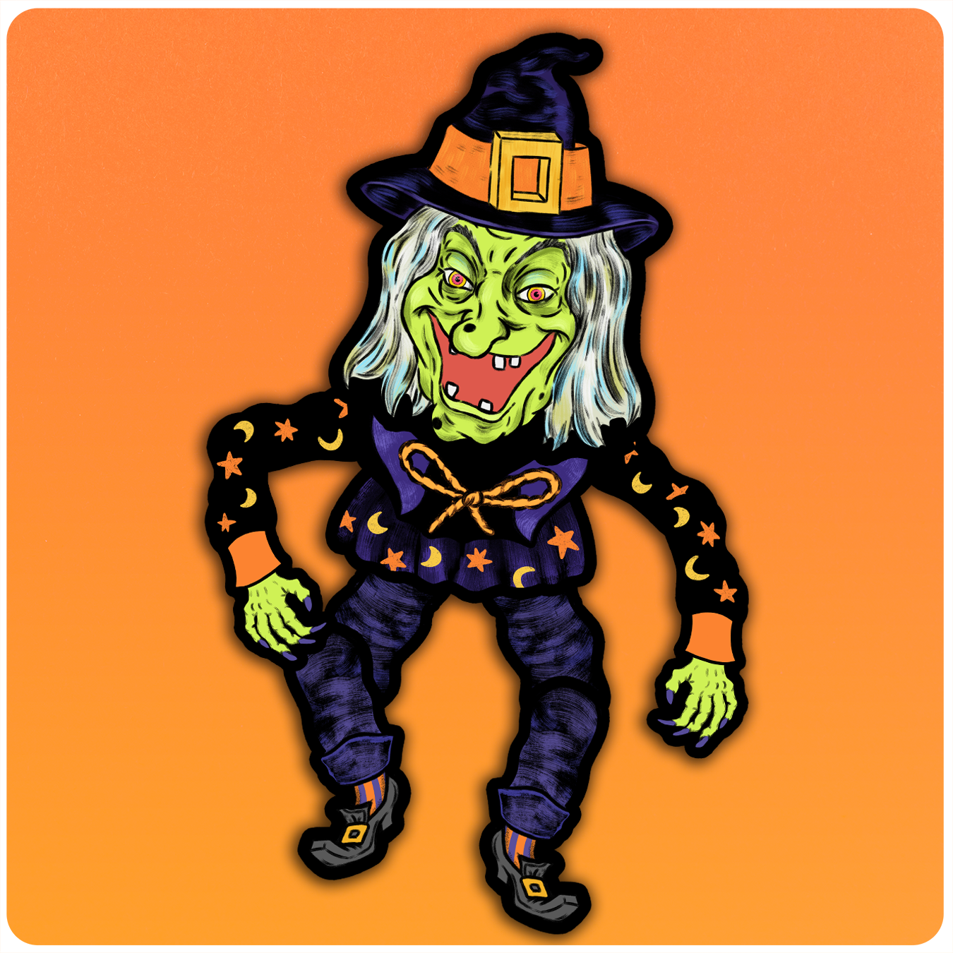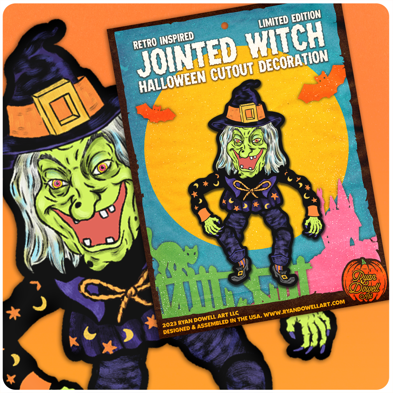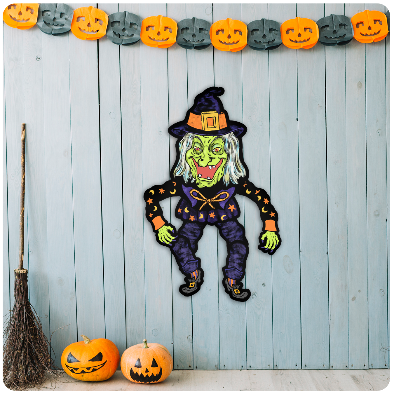 A large jointed cutout decoration of a witch with jointed arms and legs. Each decoration is printed on high-quality cardstock and arrives in resealable 12"x 9" vintage-inspired packaging. This decoration is inspired by many cutout decorations created in the sixties and seventies with large heads and different proportions.