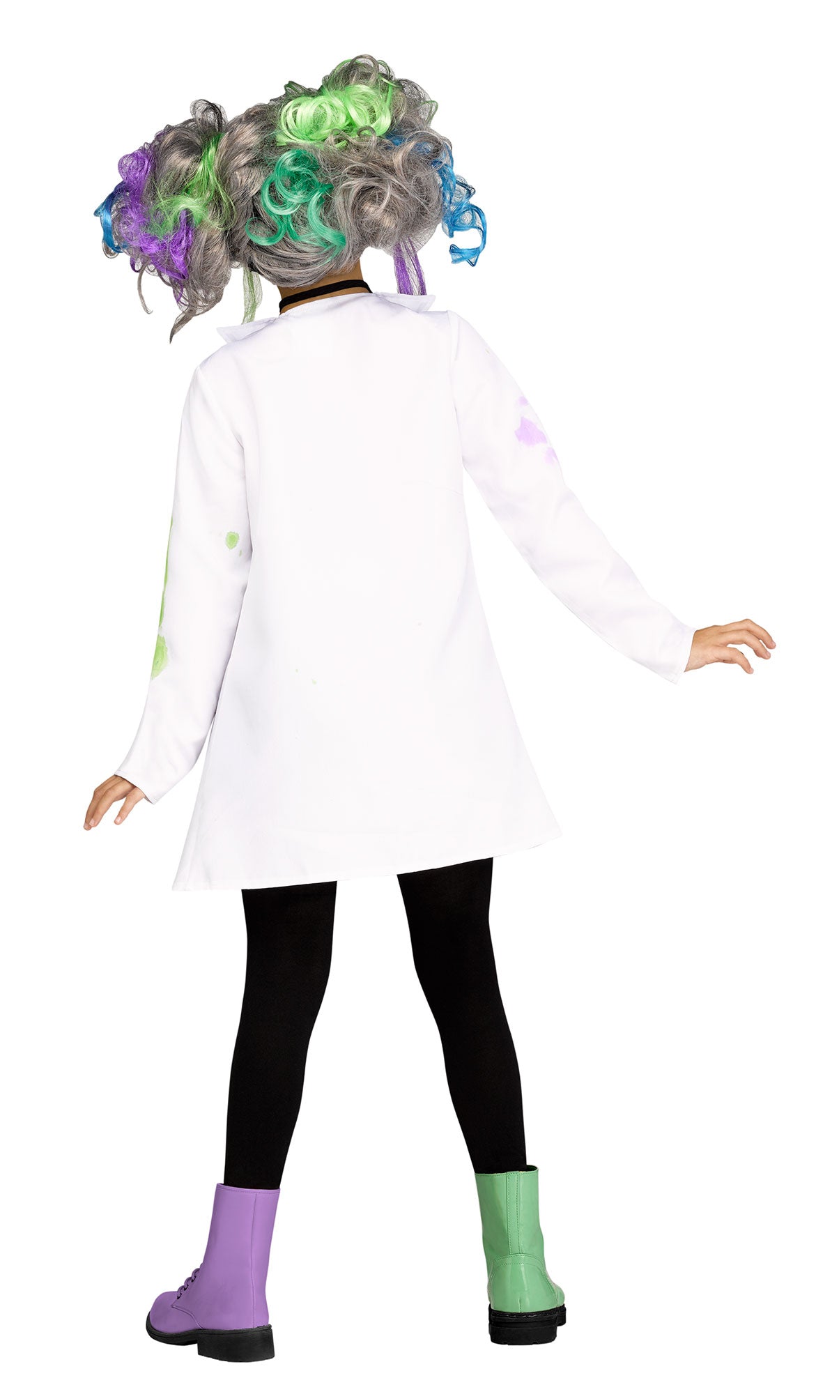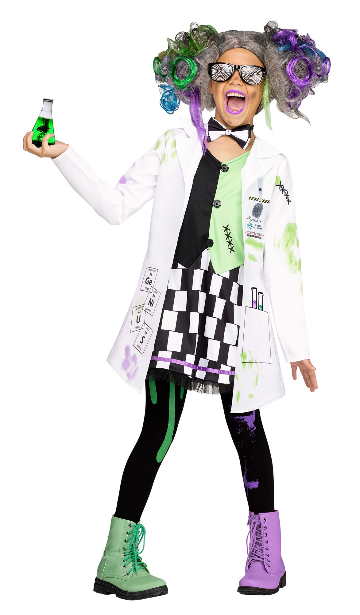 Dress your child as a future scientist with the Lab Brat Child Costume for girls. This costume features a lab coat-style dress with a "Lab Brat" logo, accessorized with glasses and matching leggings. Encourage your child's curiosity and imagination with this educational and fun costume. Available in various sizes.