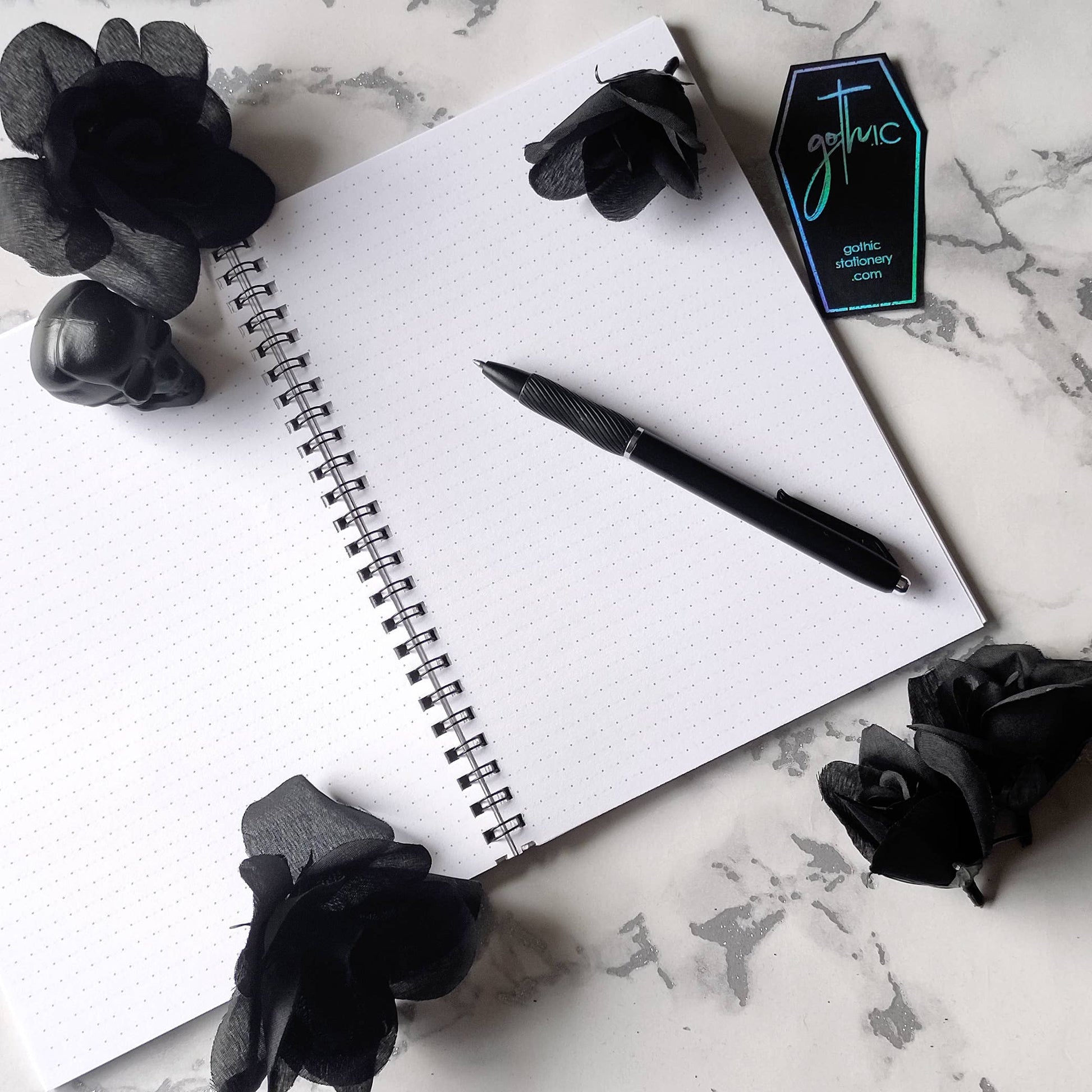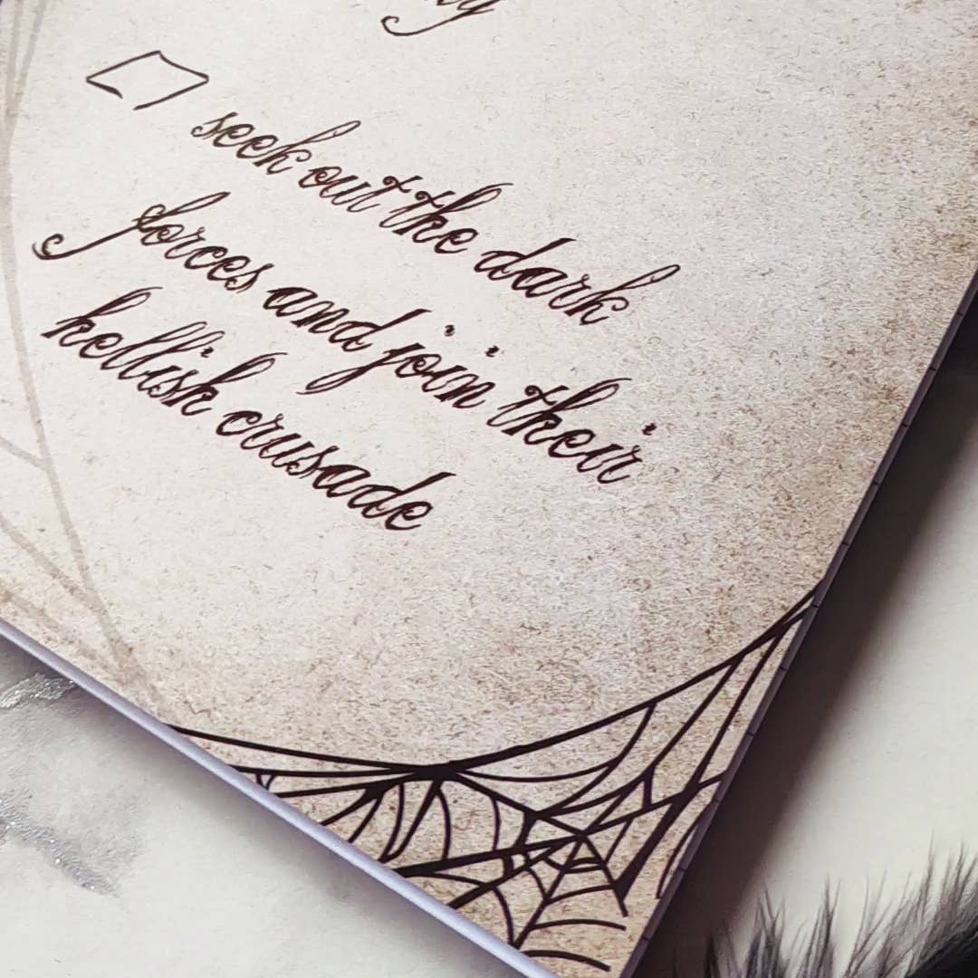 • A5 size (14.8x21cm / 5-7/8x8-1/4in) • Soft cover with 350gsm glossy laminate cardstock covers • 100 ruled pages (50 leaves), 90gsm • Black wire binding Original In-House Illustration Embrace the wisdom of Morticia Addams with our wire bound ruled notebook. Featuring her iconic movie quote about seeking out the dark forces, this notebook exudes gothic elegance and unconventional charm. Perfect for fans of the Addams Family and gothic aesthetics, it offers a stylish and functional option for note-taking, journaling, and planning.