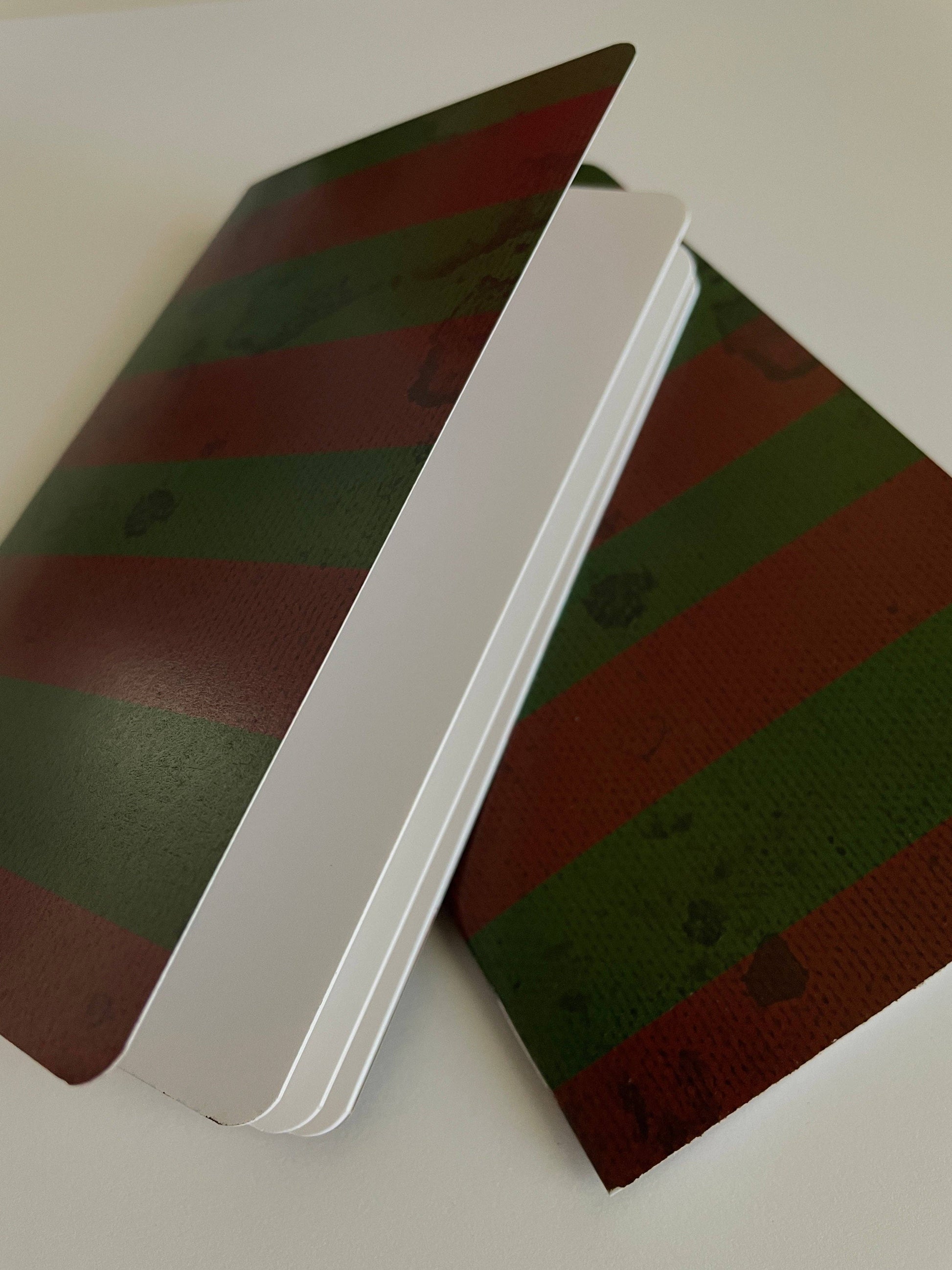 Write, sketch, and plan in your own one of a kind, pocket-sized, Nightmare on Elm Street Notebook! "One, Two, Freddy's Coming for you!" "I'll get you my pretty, and your little soul too!" A great gift for any time of the year. Iconic Book from everyone's favorite 80s Horror film, Nightmare on Elm Street! Pocket-sized, cute and fun! We included little details inspired from the film, such as the cover inspired from Freddy's famous sweater. When you open up your notebook, we also included an inside cover print with scenes of an aftermath of one of Freddy Krueger's many victims! Bring this unique notebook along everywhere you go for all your note taking needs! 5x7" 48 pg