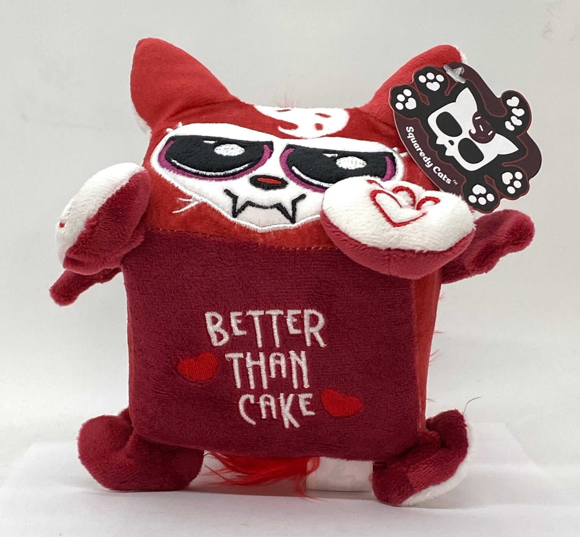 Carmina, the Red Velvet Vampire plush is a plush square cat who's also a sweet looking cake! Belly embroidery reads: "Better Than Cake!" From the BEYOND COLLECTION