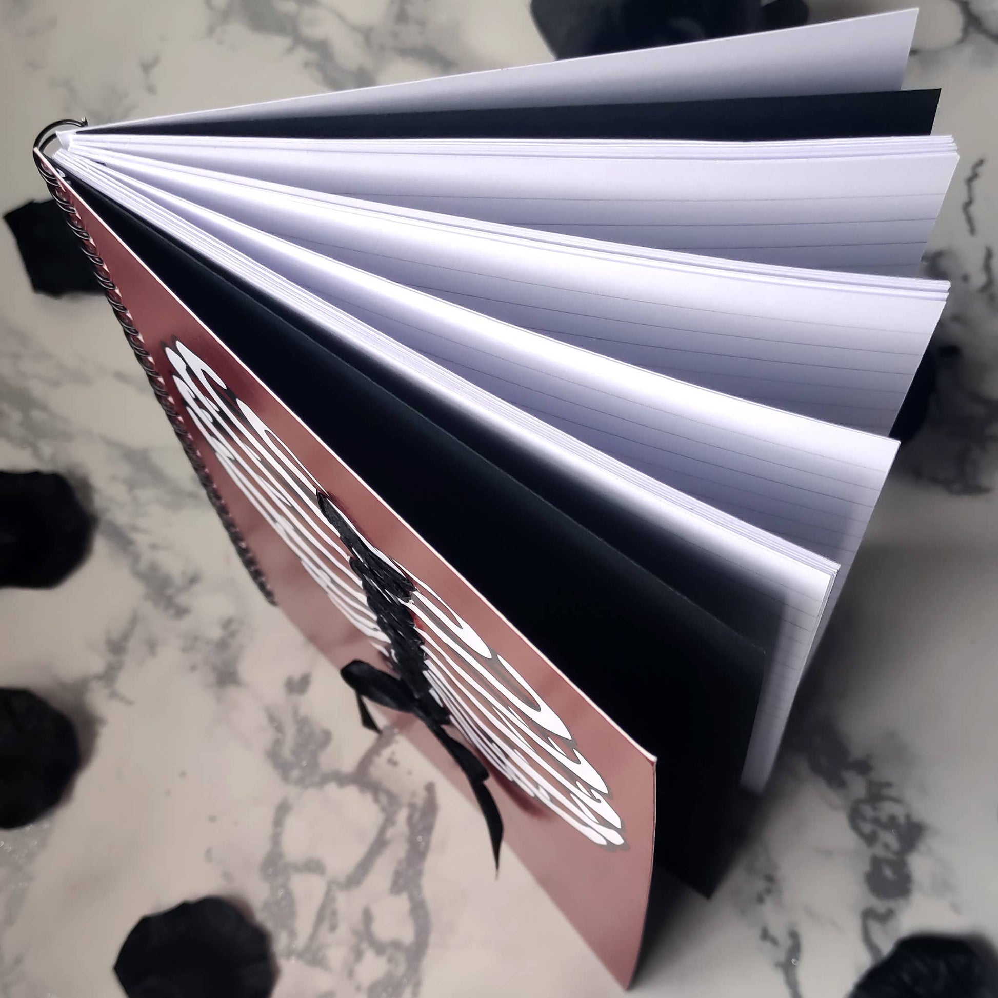 • A5 size (14.8x21cm / 5-7/8x8-1/4in) • Hand-finished lacing • Soft cover with 350gsm glossy laminate cardstock covers • 100 ruled pages (50 leaves), 90gsm • Black wire binding Perfect for fans of alternative aesthetics and dark romance, it offers a stylish and functional option for note-taking, journaling, and planning.