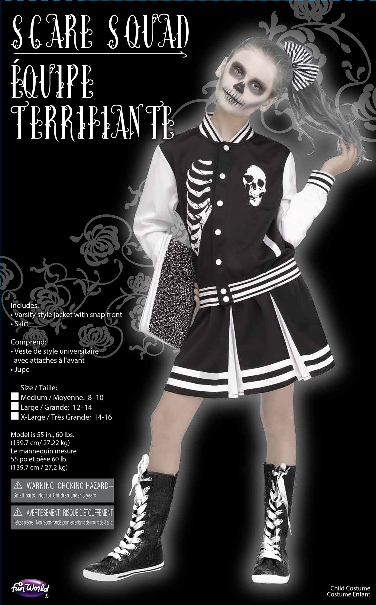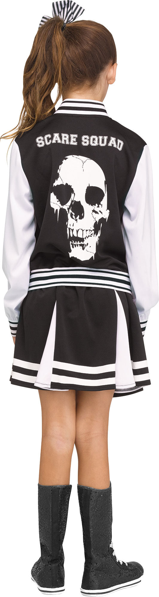 This scary black and white skeleton themed outfit features a Varsity style jacket with screened skull graphics front AND back, a snap front and ribbed accents, and a matching pleat panel cheer skirt.
