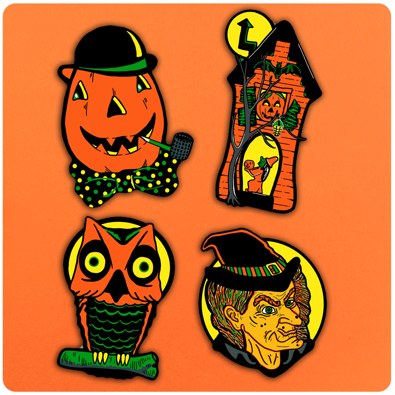 Each of the cutouts measures at just under 9" x 12" and is part of a limited edition. This set of eight pieces total was created to mash up the iconic vintage elements of both the Beistle Company's Halloween designs and retro illuminated blowmolds. Each Cutout comes printed on 110lb heavy durable satin-finish card stock.