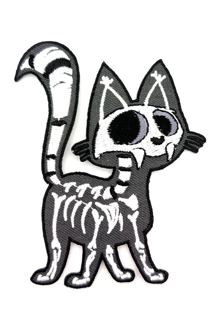 Conjure some cat power with this cute + killer cat patch! With big empty eyes, fiendish fangs, and bones all about, this creepy cat is dyying to add some spook to yer look. Hand-embroidered and highly detailed, this goth cat patch is designed to add some spook to yer style! No bones about it, yer pawsitively purrfect with this patch on yer hoodie, pants, or purse!