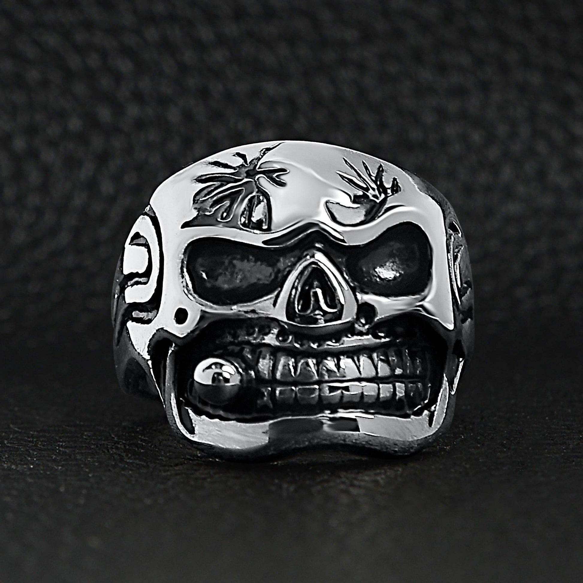 Make a bold, haunting statement with this stainless steel ring featuring a detailed skull clutching a smoldering cigar. Its rugged design merges dark elegance with rebellious charm, perfect for those who dare to stand out. Durable and striking, this ring adds an eerie edge to any outfit.